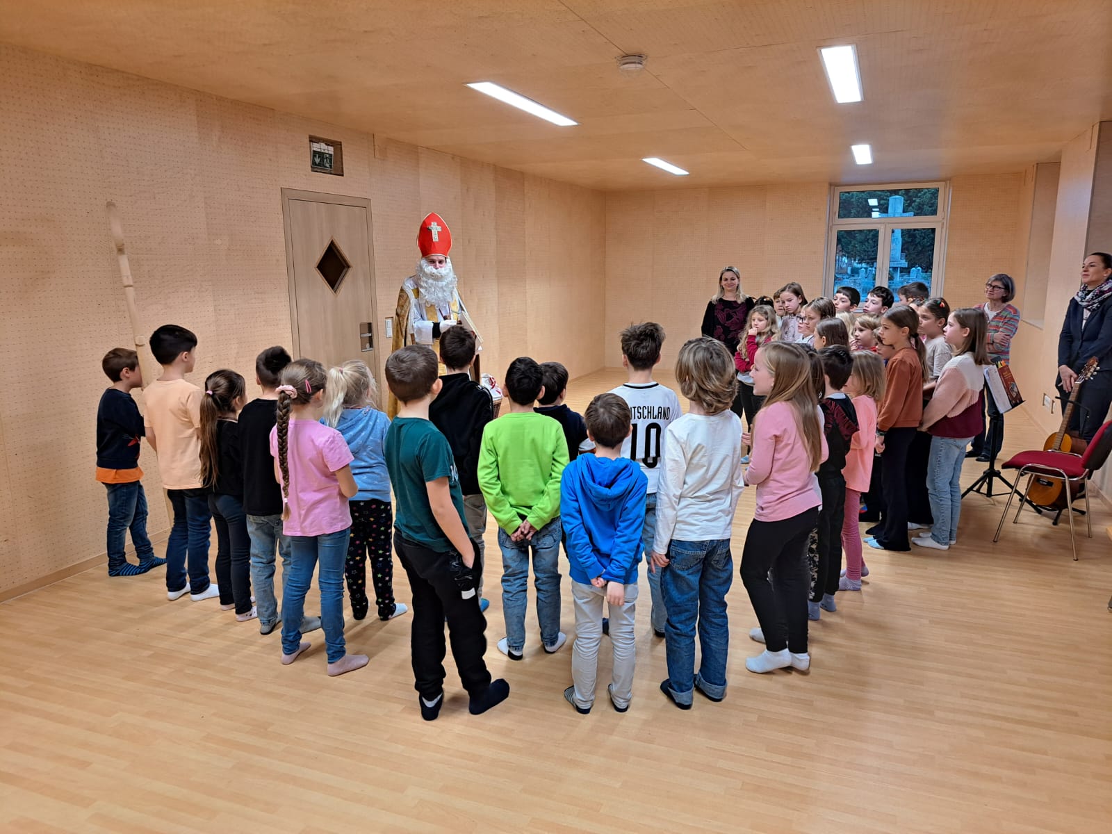 Jede Klasse sagte dem Nikolaus ein Gedicht auf. Gemeinsam sangen wir das traditionelle Nikololied „Lasst uns froh und munter sein“.