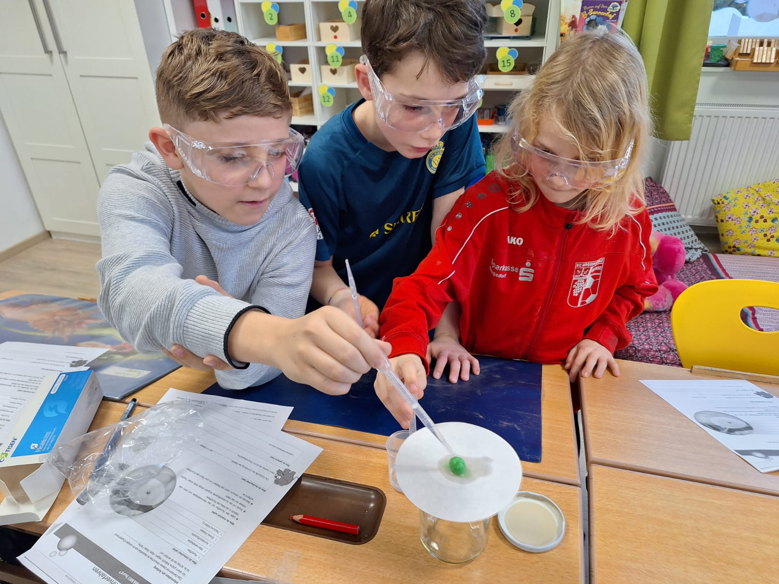 Wir stellten farbigen Kreideschaum her und beobachteten dabei, dass Gas beim Vermischen von Kalk und Säure entsteht. Weiters untersuchten wir mittels Trennverfahren, ob die Farbe schwarz tatsächlich nur einfärbig ist. Dabei entdeckten wir, dass schwarz aus vielen Farben besteht und waren darüber sehr erstaunt!