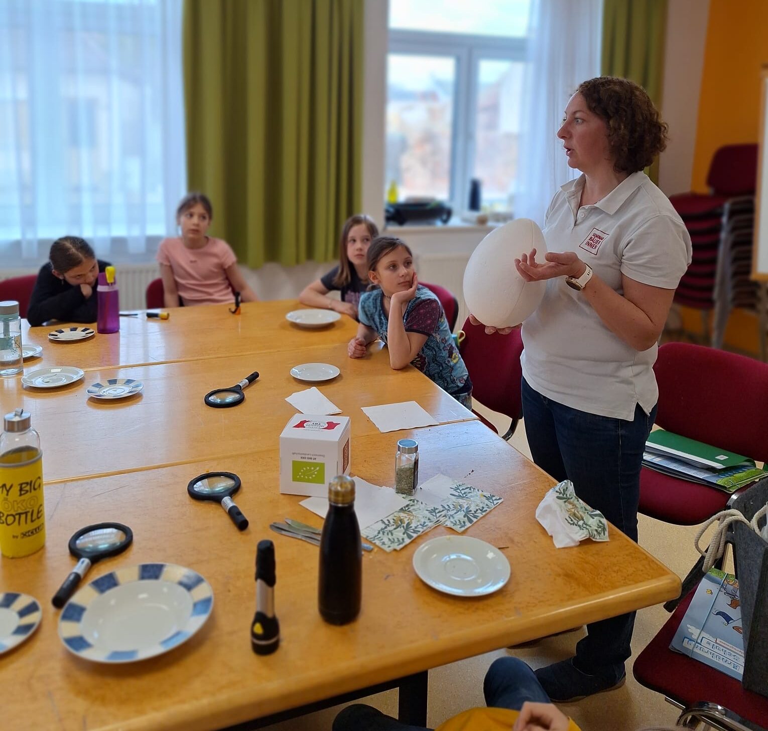Die Schülerinnen und Schüler durften selbst experimentieren und das Ei mit all seinen Bestandteilen genauer unter die Lupe nehmen. Dabei lernten sie unter anderem, aus welchen Teilen ein Ei besteht und warum Eier in der Ernährung eine wichtige Rolle spielen. Außerdem zeigte sie den Schülerinnen und Schülern unterschiedliche Eier von verschiedenen Tieren.