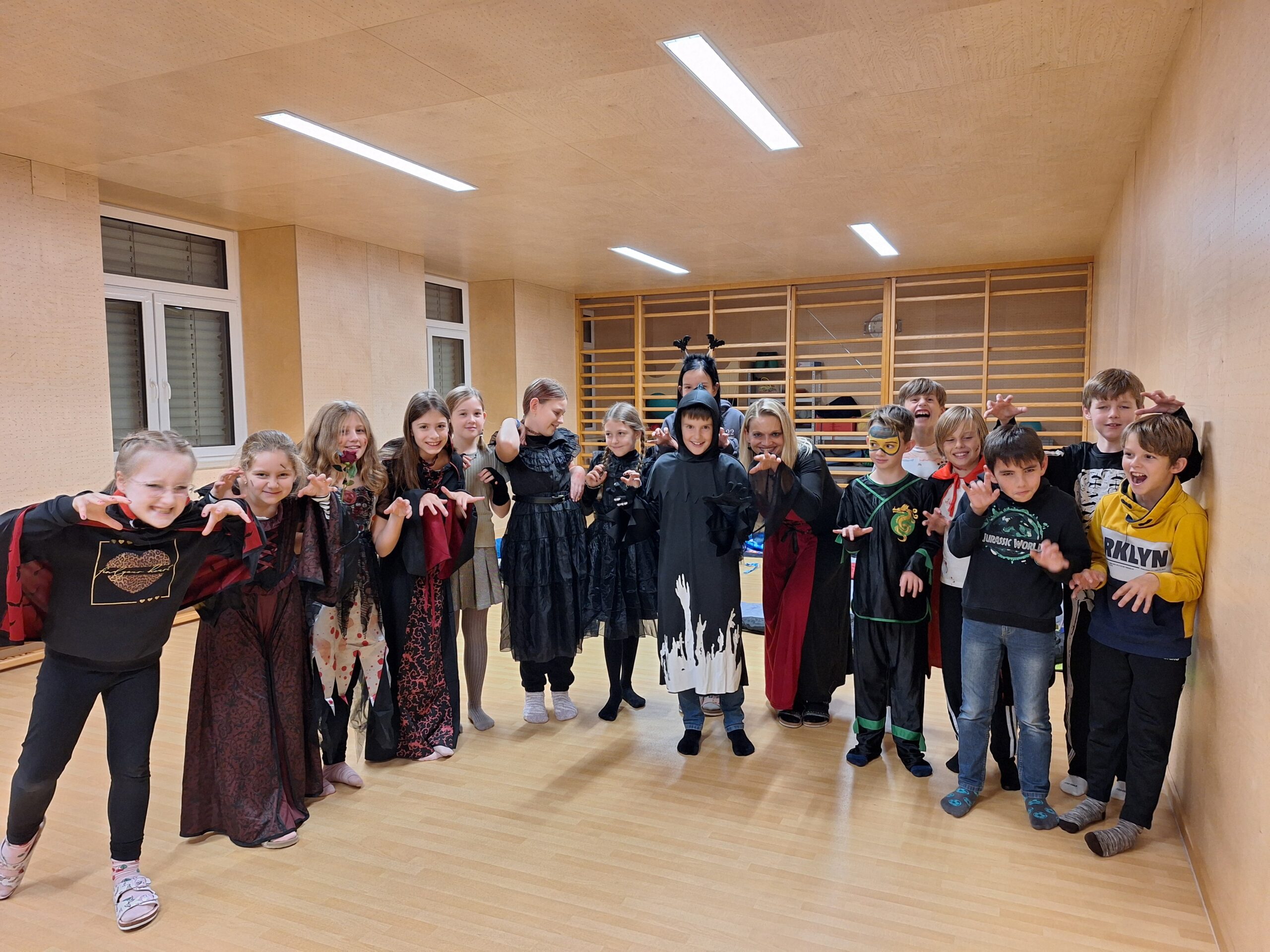 Natürlich waren alle Kinder gruselig verkleidet – Vampire, Hexen, Skelette und Geister sorgten für die richtige Halloween-Stimmung! Ein besonderes Highlight war die gruselige Nachtwanderung durch die Straßen von Alberndorf, begleitet vom Lied „Dracula-Rock“, das die Schülerinnen und Schüler voller Begeisterung und lautstark gesungen haben.